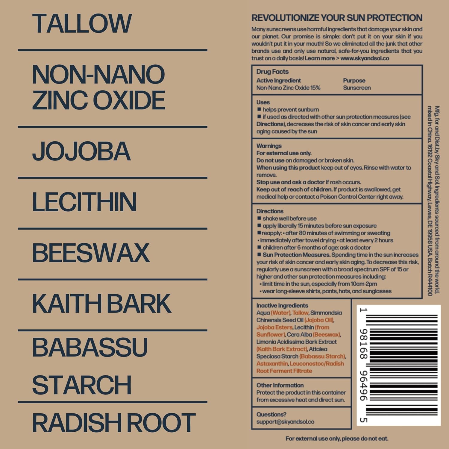 No—but that’s not its job. The real UV shield here is non-nano zinc oxide, a mineral sunscreen that sits on top of your skin and physically blocks UVA and UVB rays. Tallow’s role? It helps nourish and support your skin barrier, keeping it healthy, hydrated, and resilient under the sun.